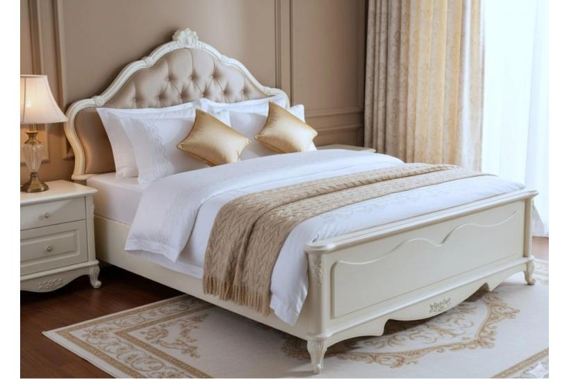 La testiera imbottita capitonné, rivestita in un delicato tessuto color champagne, cattura lo sguardo con la sua lavorazione trapuntata e i piccoli dettagli a diamante. La struttura in legno, arricchita da intagli e decorazioni floreali, è rifinita con una vernice ecologica nei toni dell’avorio ecru, che ne sottolinea la luminosità e la raffinatezza. Il risultato è un letto matrimoniale classico che si distingue per la sua presenza scenica, capace di trasformare qualsiasi ambiente in una suite dal fascino senza tempo.