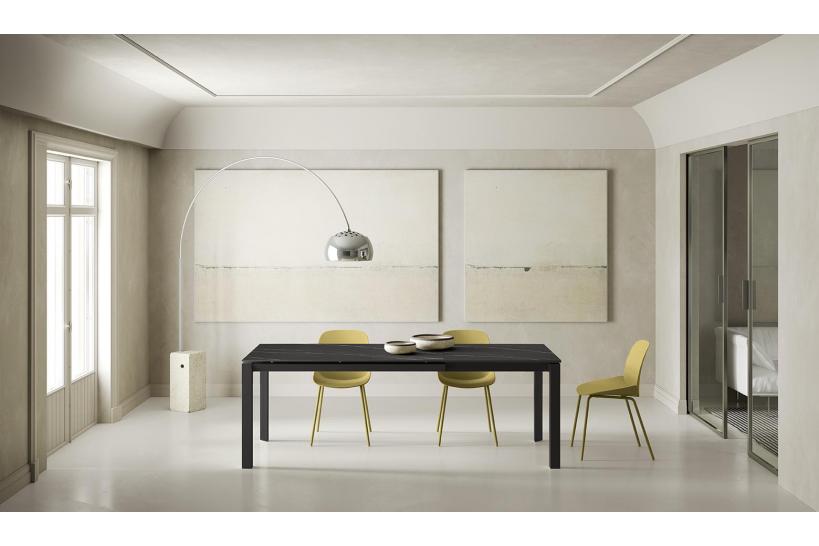 Questo raffinato tavolo trasformabile nasce per risolvere un’esigenza concreta: offrire spazio extra solo quando serve, senza sacrificare lo stile nella vita di tutti i giorni. In poche semplici mosse, la superficie in pregio ceramica effetto marmo portoro, da 90x140 cm, si estende fino a 220 cm per accogliere fino a dieci persone, regalando stabilità e un colpo d'occhio davvero sorprendente.