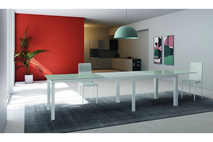 Il piano in vetro temprato bianco extrawhite, unito alle allunghe abbinate in vetro e melaminico, regala alla sala da pranzo una luminosità sorprendente e un effetto raffinato, perfetto per chi ama linee pulite e ambienti ariosi. Le gambe in resistente metallo bianco donano solidità al tavolo e contribuiscono alla sua silhouette moderna, versatile sia per arredi minimal che per spazi più classici. Tutto si fonde in uno stile contemporaneo che non passa mai di moda, pensato per accompagnarti negli anni.