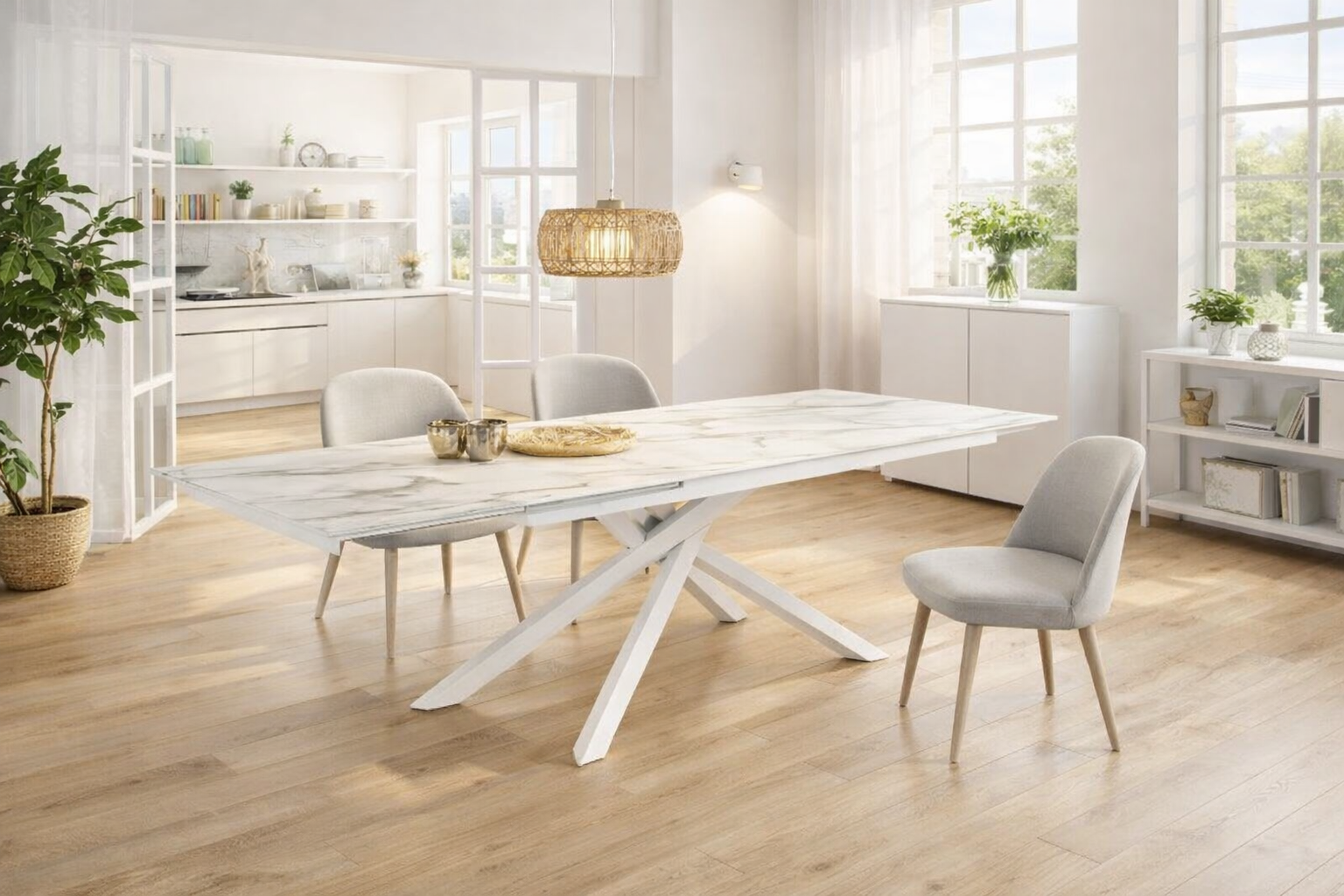 Con la sua lunghezza modulabile da 170 a 270 cm, questo raffinato tavolo moderno estensibile ti garantisce la massima flessibilità: uno stile unico quando è chiuso e la capacità di ospitare tanti ospiti quando serve. La superficie propone un effetto marmo calacatta elegante e luminoso, sostenuta da robuste gambe in metallo verniciate bianco per un look moderno e sempre attuale.