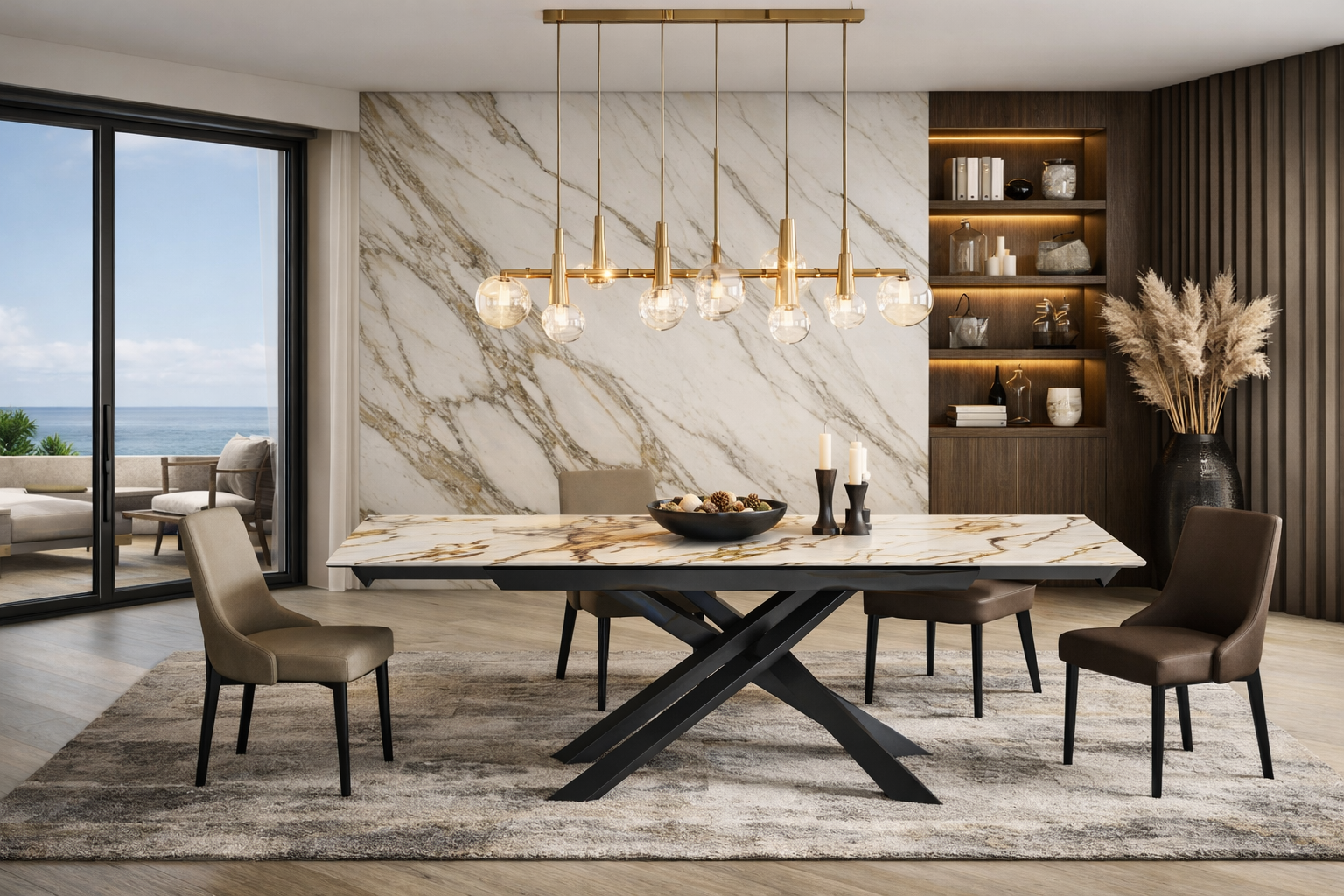 L’impatto visivo è notevole: il piano in ceramica effetto marmo Calacatta Borghini regala un’estetica sofisticata e senza tempo, abbinata alle pratiche allunghe dello stesso raffinato materiale. Le robuste gambe in metallo color bronzo donano stabilità e raccontano una storia di artigianalità contemporanea, perfetta per case moderne e ambienti living dal design ricercato.
