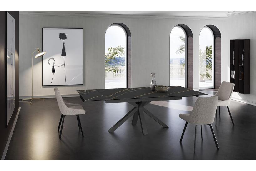 Il piano in ceramica portoro opaca colpisce per la raffinata eleganza dei dettagli, mentre le allunghe, anch’esse in ceramica portoro, mantengono un aspetto omogeneo anche da esteso. Le gambe robuste in metallo antracite donano stabilità e un tocco moderno che si integra perfettamente in ogni soggiorno, cucina o open space. L’altezza di 76 cm garantisce la massima comodità in ogni utilizzo.
