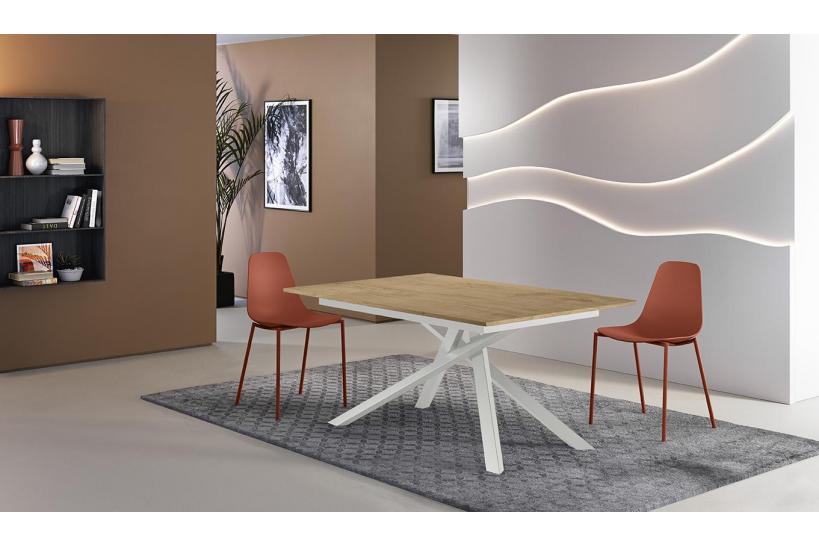 Non c’è bisogno di scegliere tra praticità e stile: il top in melaminico color rovere naturale restituisce la calda atmosfera del legno, valorizzando ogni abbinamento, dai toni minimal agli arredi più vivaci. Le gambe in metallo bianco verniciato danno un tocco di modernità e sostengono la struttura con fermezza, assicurando stabilità anche quando il tavolo è completamente esteso.