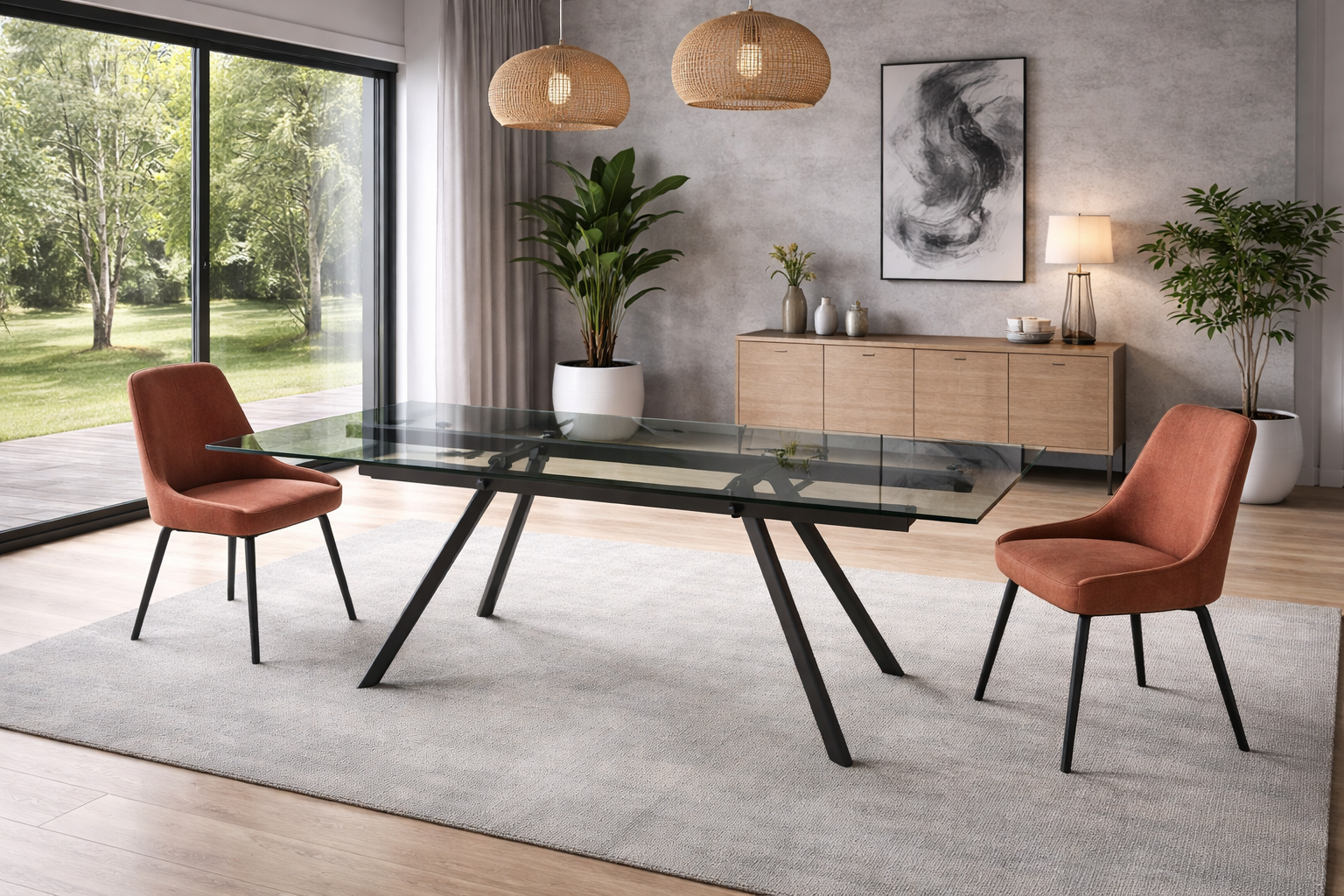 La sua superficie in vetro nero fumè cattura la luce con riflessi eleganti e dona subito un tocco contemporaneo allo spazio, mentre le solide gambe in metallo nero ne sottolineano il carattere deciso e la massima stabilità. Con una semplice mossa, il tavolo si estende da 160 cm fino a ben 240 cm di lunghezza, offrendo tutta la flessibilità che serve per accogliere ospiti inattesi, organizzare pranzi di famiglia o serate tra amici senza mai perdere stile.