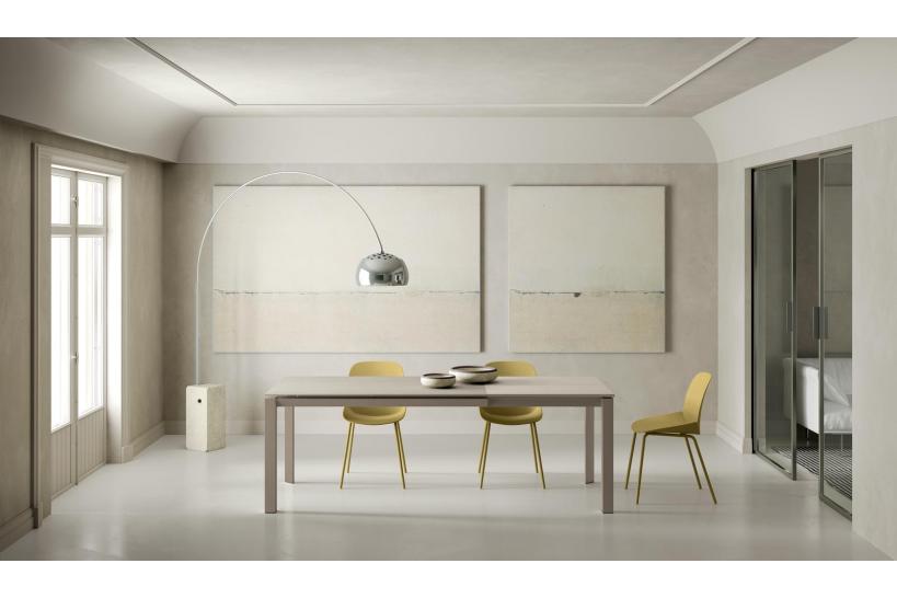 La prima cosa che colpisce è il raffinato piano in ceramica sabbia, resistente ai graffi e facile da pulire, perfetto per affrontare la quotidianità senza perdere fascino. Le allunghe in MDF, robuste ma dal design leggero, consentono un’estensione pratica e veloce, mentre le gambe in metallo verniciato sabbia donano solidità e coerenza cromatica, creando una presenza elegante ma discreta nella tua sala da pranzo.