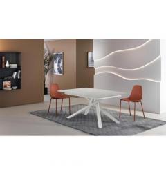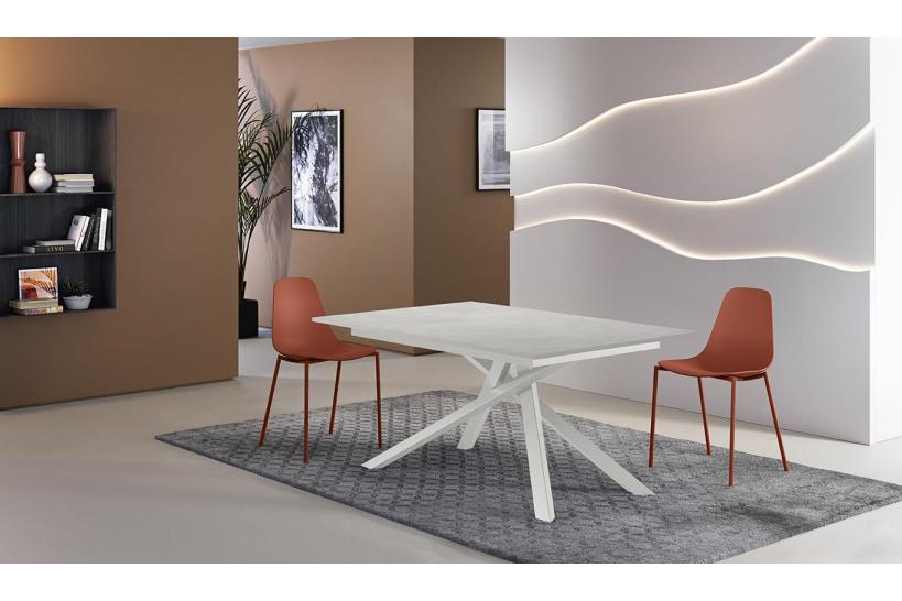 Il raffinato top in melaminico effetto cemento bianco opaco regala un tocco contemporaneo e luminoso, mentre le gambe in robusto metallo verniciato bianco donano leggerezza visiva e garantiscono stabilità, anche quando il tavolo viene allungato. Le allunghe interne sono perfettamente integrate: niente ingombri, solo comfort immediato e meccanismo intuitivo.