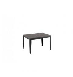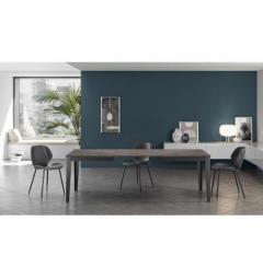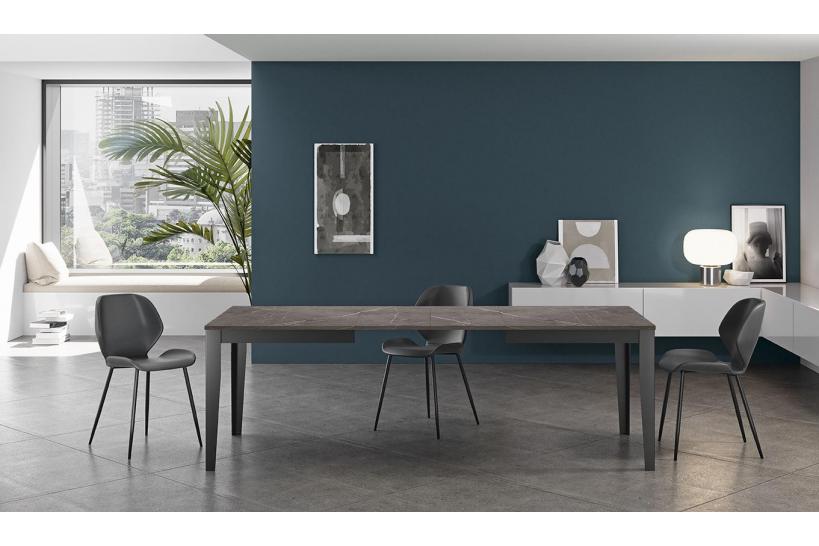 Il suo piano è realizzato in resistente melaminico effetto marmo antracite, che coniuga la raffinatezza delle finiture marmoree con la praticità di una superficie facile da pulire e da mantenere. Le inserti estensibili mantengono la stessa eleganza del top, garantendo uniformità estetica anche nelle serate più affollate. Le gambe in metallo nero, robuste e minimal, donano stabilità e un tocco di personalità urban che si integra perfettamente sia nell’arredamento moderno che in quello più classico reinterpretato.