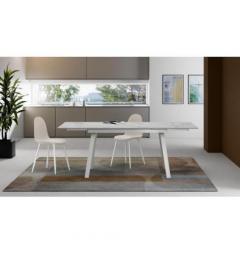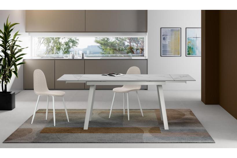 Il piano in ceramica effetto marmo bianco opaco riproduce la lucentezza e l’eleganza del marmo, ma con tutta la praticità e resistenza della ceramica: è facile da pulire, resistente a graffi e calore, perfetto per la vita di tutti i giorni. Le gambe in metallo verniciato bianco si integrano con discrezione, creando una struttura stabile e durevole senza appesantire l’ambiente, ideale anche per gli spazi più moderni.