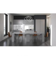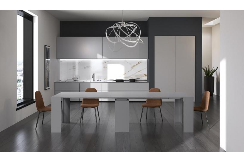 Nella scelta dei materiali, la consolle trasformabile conquista per solidità e raffinatezza. Il piano in MDF laccato grigio antigraffio (RAL indicativo 7042) è pensato per resistere all’uso quotidiano con uno stile urban-chic che si intona facilmente a qualsiasi ambiente. Le prolunghe in melaminico e le gambe robuste, anch’esse in MDF laccato della stessa tonalità, garantiscono stabilità anche alla massima estensione.