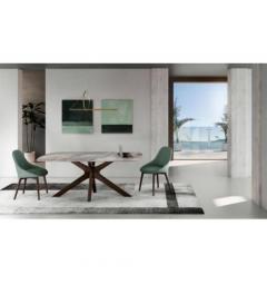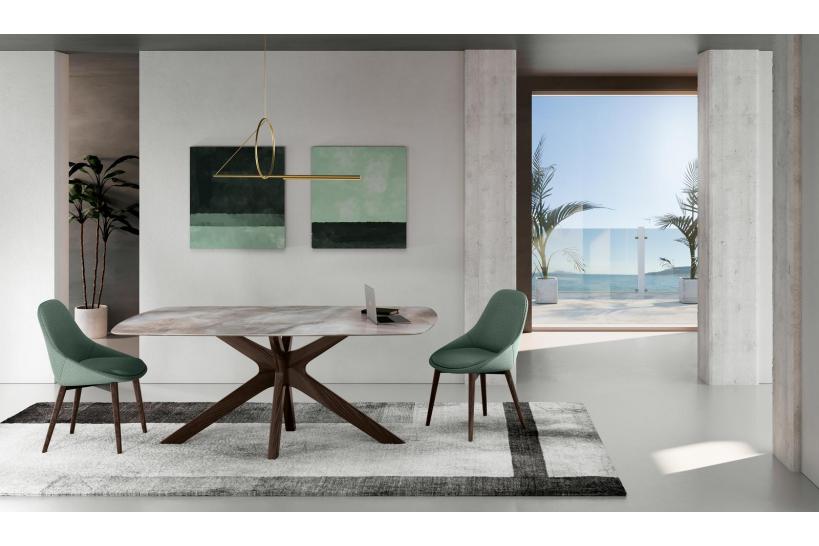 Il tavolo Sintonia si distingue per un’estetica unica: il piano in ceramica marmo alabastro, estremamente resistente e luminoso, regala alla stanza un tocco di modernità e luce, mentre le robuste gambe in massello di noce portano in casa tutto il calore del legno lavorato artigianalmente. Un mix perfetto che racconta stile e affidabilità.