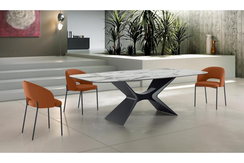 Il fascino del piano effetto marmo è valorizzato dalla struttura in metallo antracite, con finitura soft-touch che accarezza delicatamente il tatto. Le gambe robuste e dal design geometrico non solo garantiscono stabilità e sicurezza nel tempo, ma donano personalità e carattere all’intero ambiente. Grazie alla generosa dimensione di 110x220 cm, Essenza offre spazio per accogliere amici e familiari in totale comfort e convivialità.