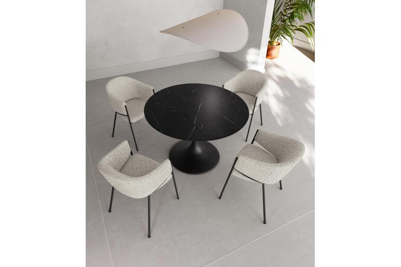 Il suo segreto? Un piano in ceramica effetto marmo nero che regala un look ricercato e moderno, capace di valorizzare anche gli spazi più minimali. La base in metallo verniciato, sempre in nero, assicura una stabilità eccezionale e contribuisce a un fascino urbano e sofisticato. Grazie alle sue proporzioni compatte – 100cm x 100cm con altezza 76cm – è la soluzione ideale per chi desidera ottimizzare lo spazio senza rinunciare allo stile.