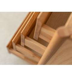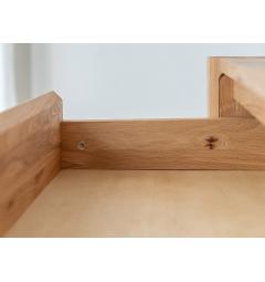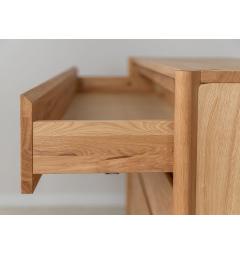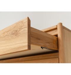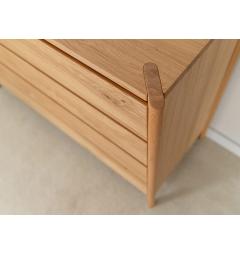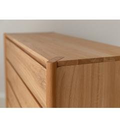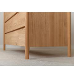La calda tonalità del rovere naturale, valorizzata dalla finitura a olio, esalta la venatura viva del legno, rendendo ogni pezzo unico. Le leggere variazioni cromatiche, i nodi e le fibre irregolari raccontano la storia della materia prima, donando carattere e personalità alla cassettiera.