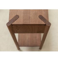 Questa consolle moderna in rovere massello tabacco si distingue per la struttura leggera e ben proporzionata. Quattro gambe cilindriche sostengono il piano superiore creando un equilibrio visivo tra solidità e leggerezza.
