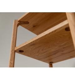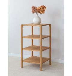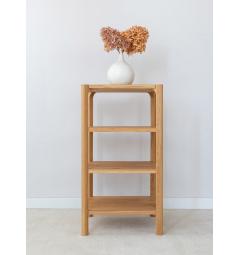 Il design punta sulla semplicità delle linee: quattro montanti verticali solidi sostengono tre ripiani regolari, creando una forma equilibrata e funzionale. I bordi smussati, le superfici levigate e le gambe cilindriche alleggeriscono il mobile, rendendolo elegante senza sacrificare stabilità e robustezza.