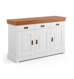 Nella credenza lo spazio è organizzato al meglio: oltre a tre comodi cassetti con chiusura ammortizzata la cassettiera è dotata di tre ante ripartite in ripiani regolabili per permettervi di riporre ogni oggetto secondo le vostre esigenze. Il mobile è protetto dagli agenti atmosferici con una vernice ad acqua ecologica con un grado di copertura all'85% che non cancella la bellezza naturale del legno con le sue venature e i suoi nodi.