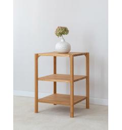 Il design dello scaffale punta tutto sulla semplicità delle forme. Quattro montanti verticali sottili ma solidi sostengono tre ripiani quadrati disposti in modo regolare, creando una struttura equilibrata e molto funzionale.