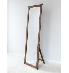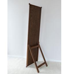 La struttura è leggermente inclinata all’indietro e dotata di un sostegno posteriore integrato: il cavalletto, solido ma visivamente leggero, garantisce stabilità e armonia formale. Il risultato è uno specchio rettangolare autoportante che si appoggia con eleganza alla parete, senza necessità di fissaggi.