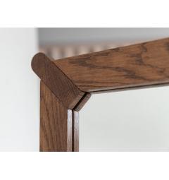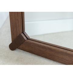 La cornice dello specchio da terra rettangolare in legno massello è definita da linee essenziali e angoli raccordati, pensati per alleggerire visivamente la struttura. Negli spigoli superiori e inferiori emergono inserti sagomati in legno dalle forme morbide e arrotondate: dettagli distintivi che celebrano la qualità dell’incastro e la cura artigianale della lavorazione.