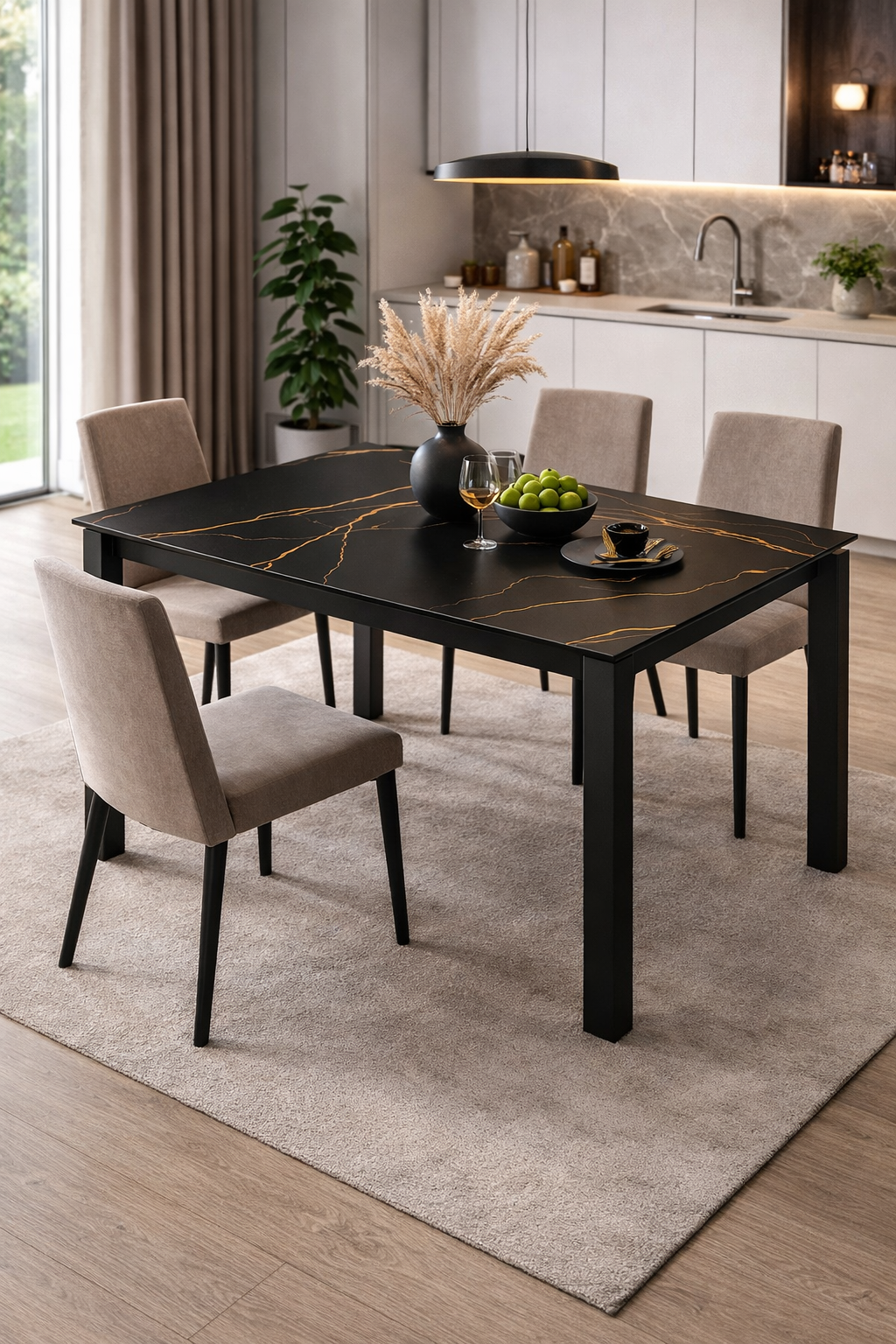 A colpo d’occhio, ciò che cattura è il raffinato piano in ceramica effetto marmo nero portoro, opaco e setoso, un materiale moderno che ricorda le pietre più nobili ma offre la massima resistenza a graffi, calore e usura. La struttura in metallo verniciato nero, dal design pulito, sostiene la superficie e dona stabilità, contrastando armoniosamente con il top per creare un arredo di grande impatto visivo. Il dettaglio che fa la differenza? Le allunghe interne, invisibili quando non servono, trasformano con discrezione il tavolo da 120 a 170 cm: lo spazio perfetto per cene con amici o pranzi in famiglia.