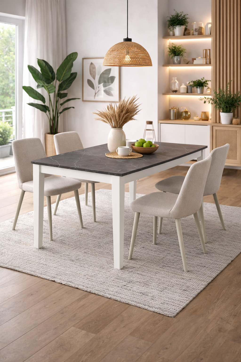 Il piano del tavolo moderno, realizzato in resistente melaminico effetto marmo antracite, esalta l’ambiente con una nota sofisticata ma facile da pulire, perfetta per le esigenze di una famiglia dinamica. Le robuste gambe in metallo bianco, dal design geometrico e minimale, aggiungono carattere e assicurano la massima stabilità in ogni configurazione, mentre le prolunghe, semplici da inserire, mantengono continuità nello stile e nella robustezza.