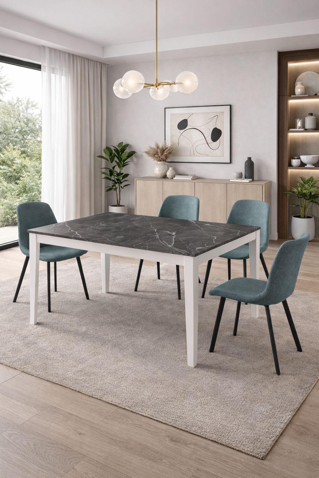 Ogni dettaglio del tavolo estensibile Spazio 156/316 x 90 cm è studiato per rispondere ai ritmi dinamici delle case di oggi. La superficie, spaziosa e raffinata, è realizzata in melaminico effetto marmo antracite: un materiale resistente, antimacchia e facilissimo da pulire, perfetto per l’uso quotidiano ma sempre scenografico nelle grandi occasioni. Le robuste gambe in metallo verniciato bianco donano una nota di freschezza e garantiscono stabilità anche al massimo dell’estensione.