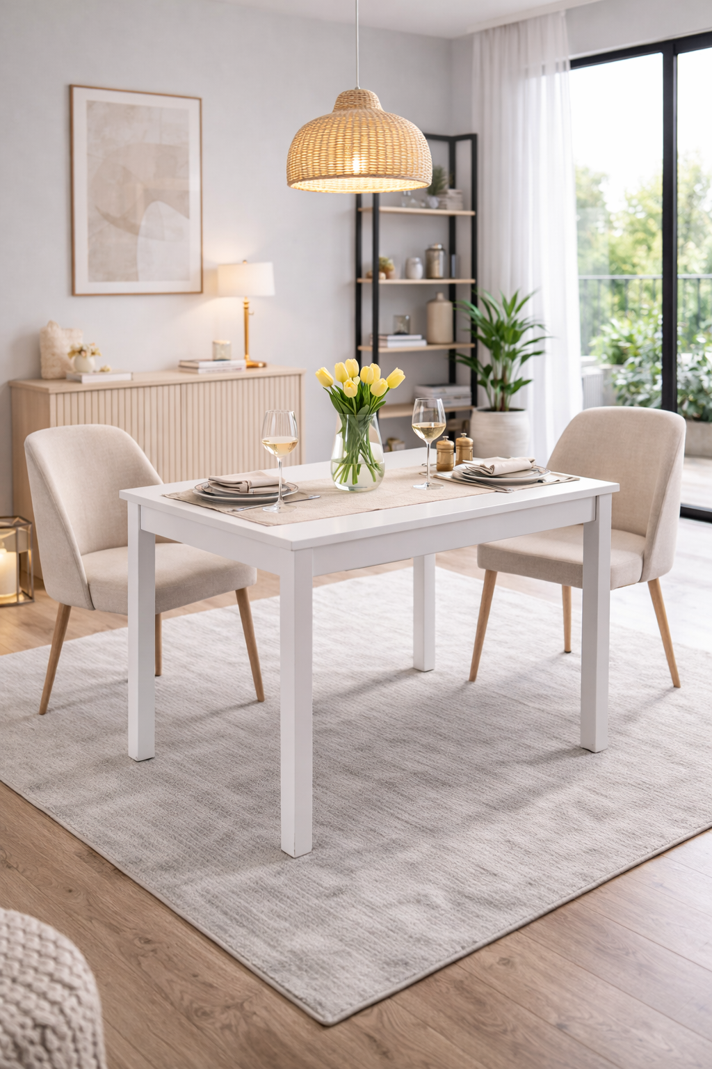 Il piano in melaminico bianco frassinato esprime una raffinatezza luminosa e si pulisce con estrema facilità: dimentica le preoccupazioni per macchie o graffi, anche negli usi intensivi di tutti i giorni. Le robuste gambe in faggio massello verniciate bianche garantiscono stabilità e un tocco naturale che si fonde armoniosamente con qualsiasi stile d’arredo, dal contemporaneo allo scandinavo.