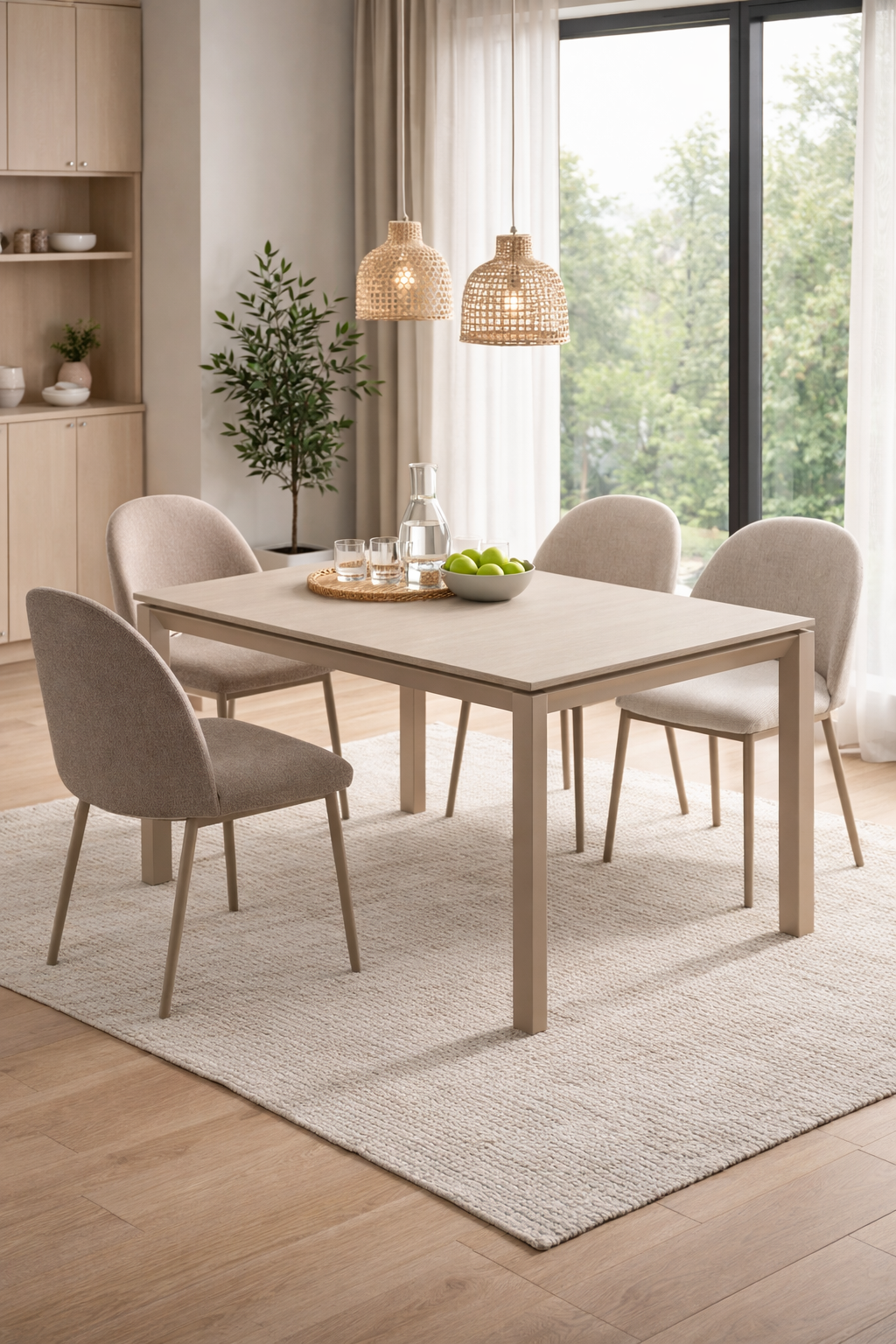 La prima cosa che colpisce è il raffinato piano in ceramica sabbia, resistente ai graffi e facile da pulire, perfetto per affrontare la quotidianità senza perdere fascino. Le allunghe in MDF, robuste ma dal design leggero, consentono un’estensione pratica e veloce, mentre le gambe in metallo verniciato sabbia donano solidità e coerenza cromatica, creando una presenza elegante ma discreta nella tua sala da pranzo.