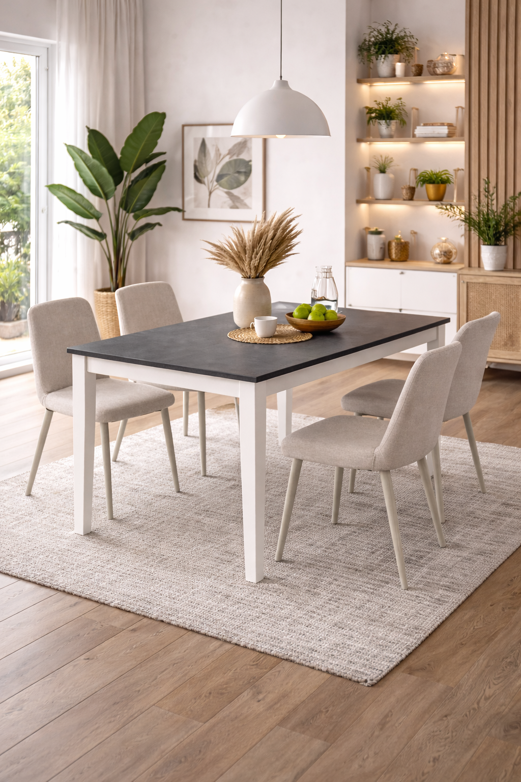 Questa tavola moderna unisce linee pulite e colori raffinati: il piano effetto cemento grigio, in resistente melaminico, trasmette subito una sensazione di eleganza contemporanea. Le robuste gambe in metallo bianco offrono un contrasto luminoso e attuale, perfetto per ambienti sia giovani che più classici. Grazie all’allunga fino a 290 cm, può accogliere comodamente tutti i tuoi ospiti in occasione di pranzi, feste o riunioni di famiglia. Quando non serve, si richiude occupando il minimo spazio: libertà totale di organizzare la casa come vuoi!