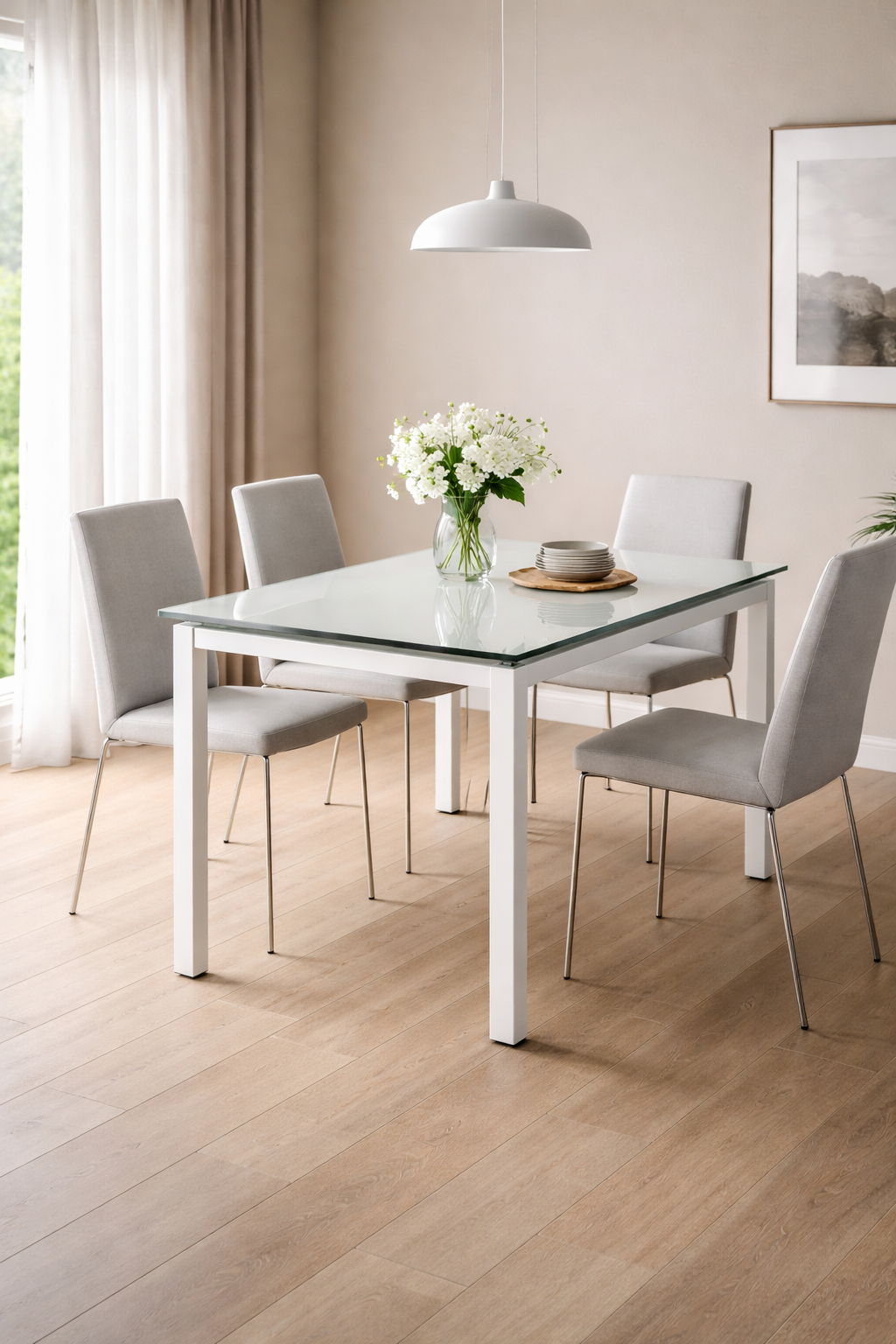 Più spazio quando serve, zero ingombro quando non ti occorre. E non è tutto: il piano in resistente vetro temperato color bianco dona luminosità e una sensazione di freschezza, mentre le gambe in metallo verniciato bianco assicurano solidità e un carattere deciso che si fa notare senza essere invadente. Così, ogni stanza appare subito più ampia e ordinata, pronta ad accogliere ospiti o a ritagliarti un momento tutto per te.