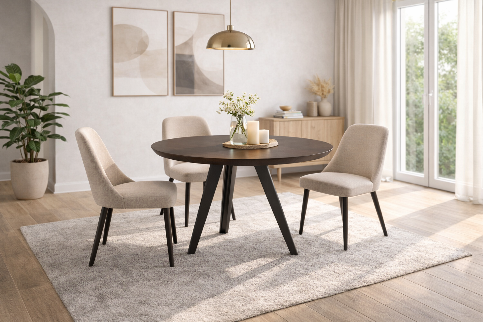 Con un piano rotondo ampio e armonioso di 130 cm di diametro, questo tavolo moderno fisso offre la combinazione ideale tra estetica moderna e funzionalità. Il top in rovere impiallacciato naturale, dalla texture raffinata e accogliente, ti regala subito una sensazione di calore e autenticità. Le gambe in metallo nero verniciato conferiscono stabilità assoluta e un tocco contemporaneo che valorizza senza appesantire.