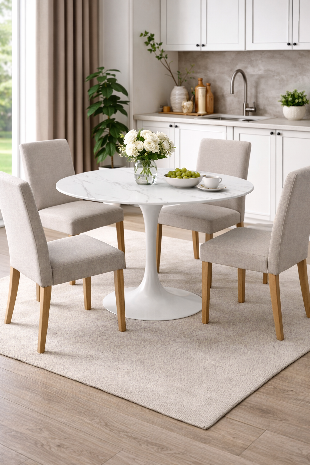 Il piano da 120x120 cm, in raffinata ceramica effetto marmo bianco, veste qualsiasi ambiente con un’eleganza luminosa e senza eccessi. Perfetto per chi ama una casa accogliente ma sa quanto siano importanti la resistenza e la facilità di pulizia: la ceramica, materiale tecnologico di ultima generazione, resiste a graffi, calore e macchie, restando brillante nel tempo senza bisogno di attenzioni particolari.